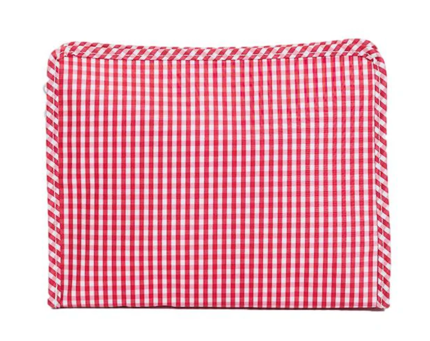 Cotton fabric with a thin, eco-friendly matte coating, lined with poly twill, an inside slip pocket, and exterior snap open zip tabs. Water and stain resistant and wipeable inside and out! Large measures 10.5" x 8.74" x 3.5". Medium measures 9" x 7.25" x 3". (Sold Separately)